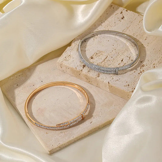 Half Pave Zircon Gemstone Hinged Oval Bangle, Gold Or Silver - Fashion Jewelry